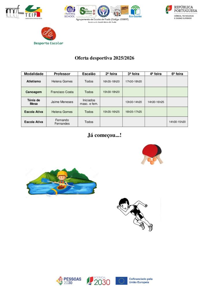 Atividades desportivas regulares, com competição interescolar, com participação obrigatória nas provas oficiais: Canoagem, Atletismo e Ténis de Mesa (horários a anunciar)